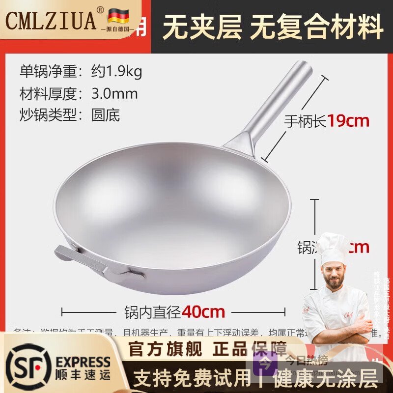 cmlziua德国纯钛炒锅家用无涂层少油烟圆底不粘锅一体锅厨具轻便燃气专用 【纯钛圆底】有耳炒锅 4¥