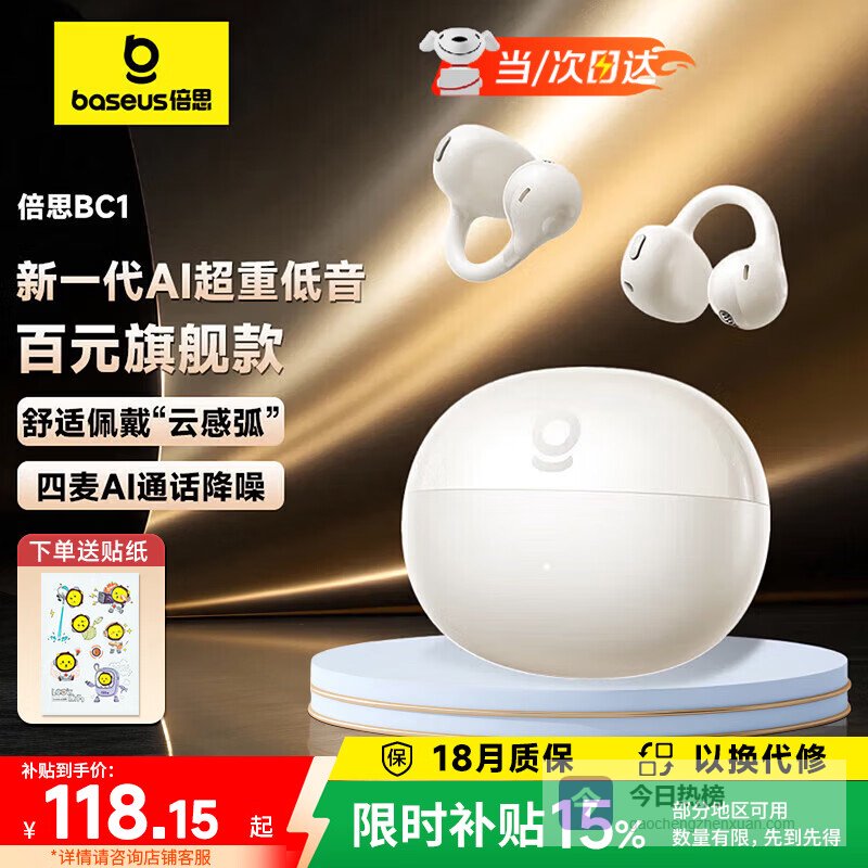 【品牌直营】倍思BC1蓝牙6.0耳机耳夹式骨传导概念开放式无线不入耳运动跑步通话AI降噪耳麦适用苹果¥