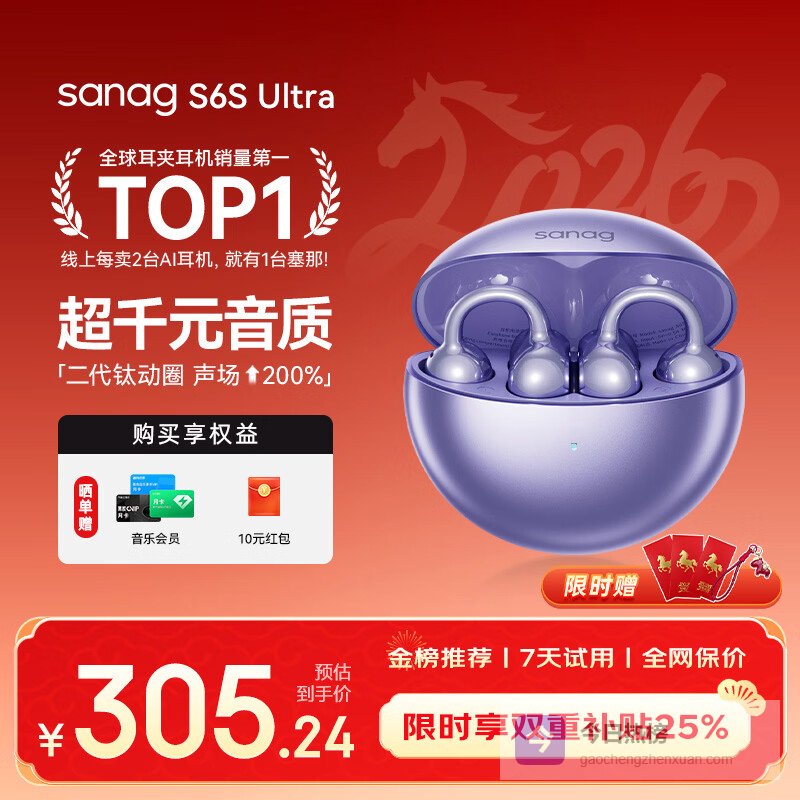 【京东自营】SANAG塞那S6SUltra【补贴立减15%】蓝牙耳机耳夹式气骨传导概念开放式不入耳运¥