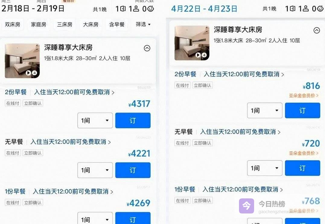 2月9日,平台显示汕头万象城华山南路亚朵酒店的大年初二“深睡尊享大床房”报价4221元,平日约720元,涨幅近5倍