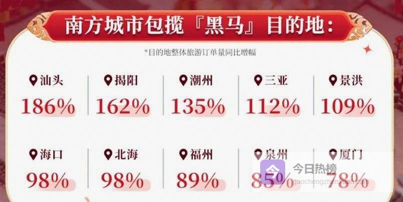 携程显示,今年春节汕头酒店预订量同比上涨186%,潮汕的揭阳、潮州也分别上涨162%和135%,远超传统春节热门的三亚