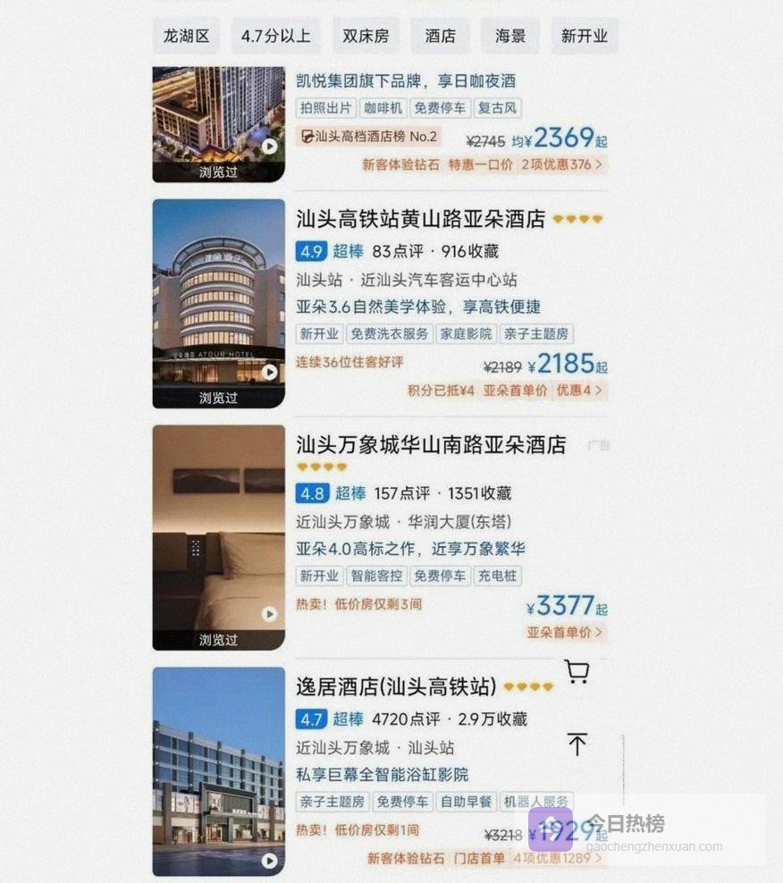 一位湖北网友计划春节在汕头小公园逛年味,打开平台,皇后酒店蹦出6719元一晚,旁边喜来登、万豪也在3000元左右