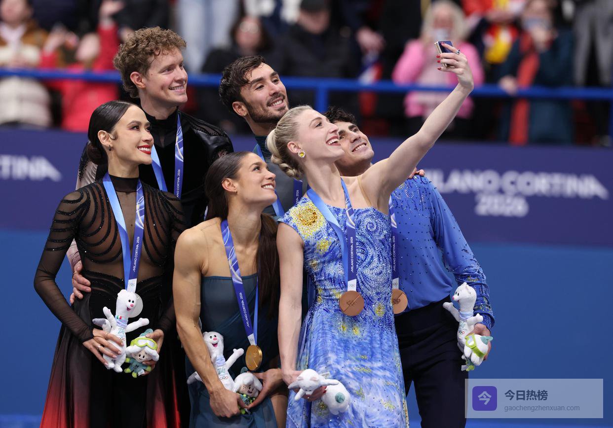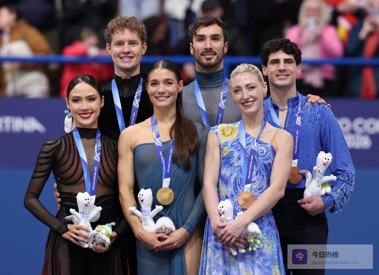 ↑2月11日,亚军美国组合乔克/贝茨、冠军法国组合富尼耶·博德里/西泽龙和季军加拿大组合吉勒斯/波里尔(从左至右)在颁奖仪式上合影。新华社记者 陈益宸 摄