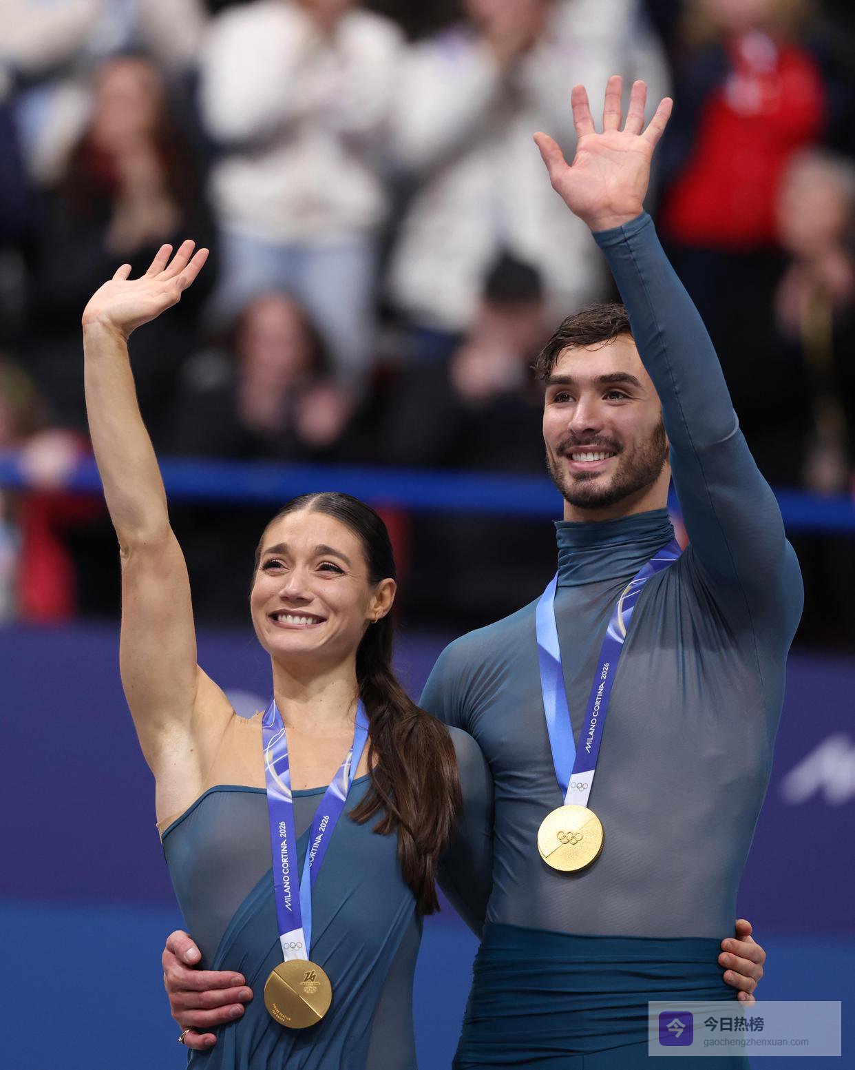 ↑2月11日,法国组合富尼耶·博德里/西泽龙在自由舞比赛中向观众致意。他们获得冰舞冠军。新华社记者 陈益宸 摄