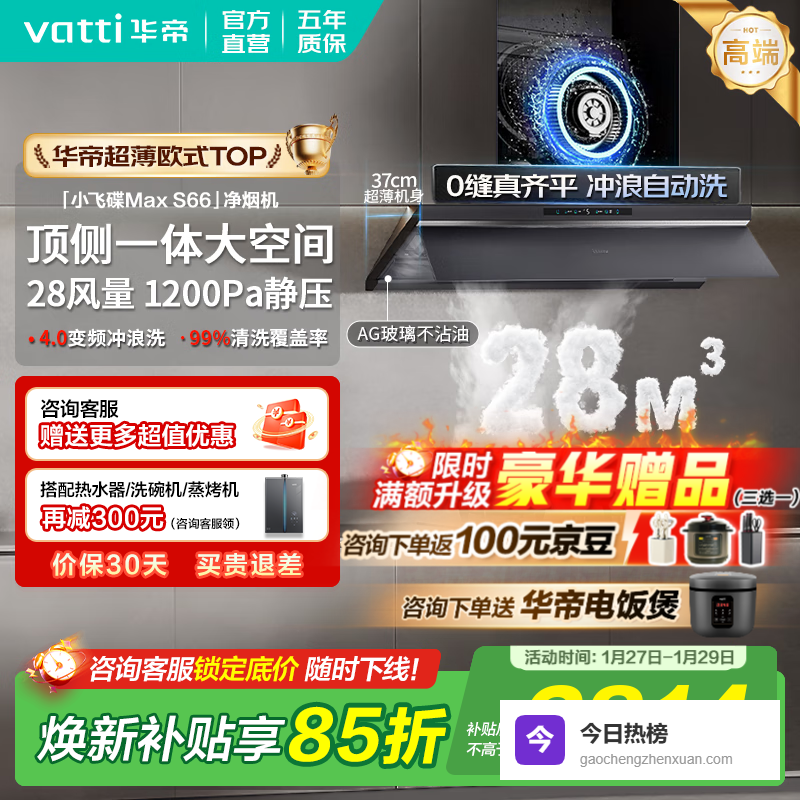 华帝油烟机【小飞碟MaxS66】顶侧一体吸抽油烟机超薄平嵌28大吸力家用自清洁一级能效上门安装国家补贴 【AG玻璃】S66 高端旗舰/28大风量¥