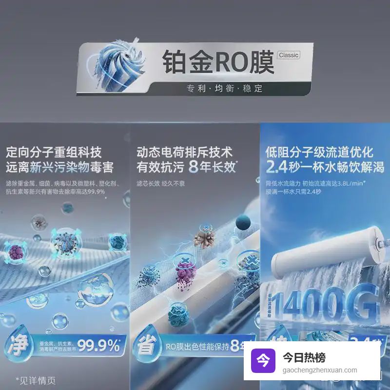 高效多层滤芯设计:结合进口专业滤芯与独特阶梯净化工艺,确保净水效果达到行业领先水平。16页超长RO膜的配置,远超同类产品,大幅提升了过滤精度与使用寿命,让您在享受洁净饮水的同时,降低对维护的频率,真的很省心。