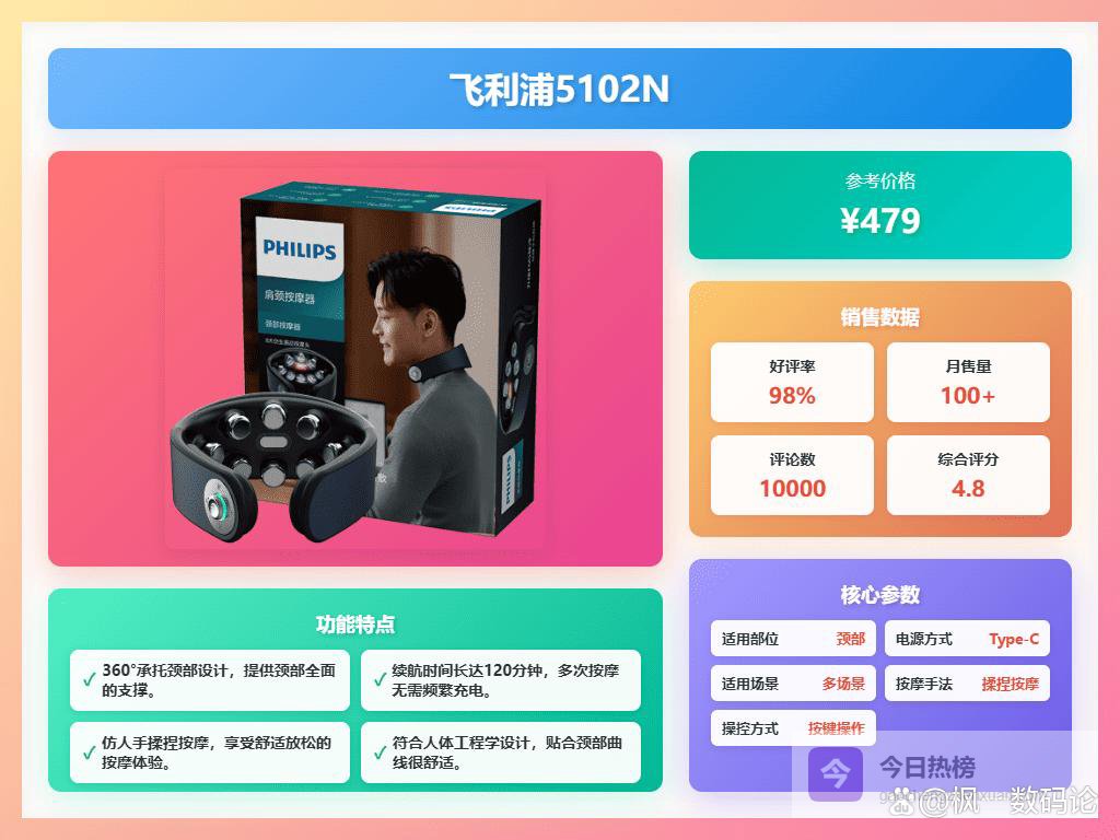 2026肩颈按摩枕选购攻略:精选十大排名肩颈按摩枕,这几款值得推荐!一、飞利浦仿生揉捏:采用4点深层揉捏设计,模仿人手抓揉的感觉,提供像双手一样的按摩体验,特别适合在家里、办公室或出差途中想放松一下。手感自然舒服,按摩力度刚刚好,不会太硬也不太软。