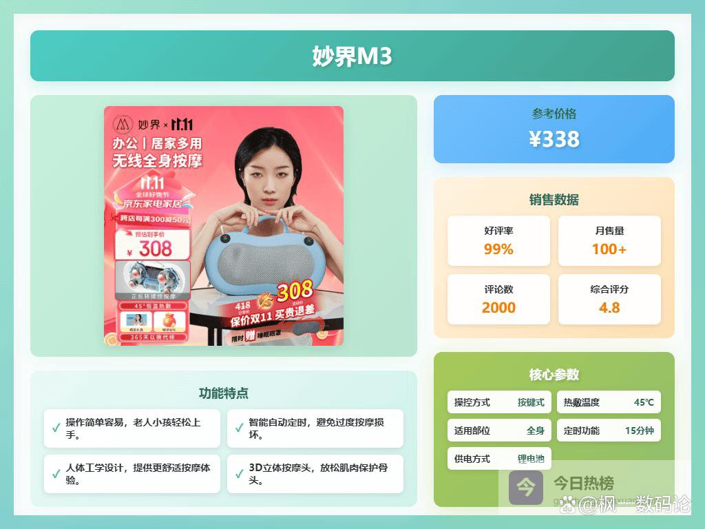 除了按摩功能,便携性和操作性也是要考虑的因素。如果你经常出差或者需要在办公室使用,那无线款的肩颈按摩枕会更方便,像妙界、京东京造都有无线款,摆脱了线缆的束缚,随时随地都能用。操作方面,按键要简单明了,最好有语音提示,这样即使是老人也能轻松上手。此外,还要注意材质的舒适度和安全性,毕竟是贴身使用的东西,亲肤透气的材质会更好。再就是,别盲目追求大牌,多看看用户的真实评价,结合自己的实际需求,才能选到真正适合自己的肩颈按摩枕。