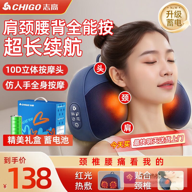 志高(CHIGO)颈椎按摩器肩颈按摩枕头按摩仪仿人手腰椎背部揉捏全身热敷按摩垫元旦情人节送男女朋友生日礼品物 【充电礼盒款蓝色】20颗按摩头+六键调节+红光热敷¥
