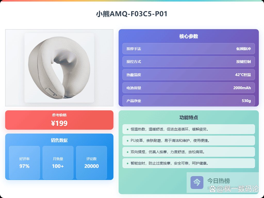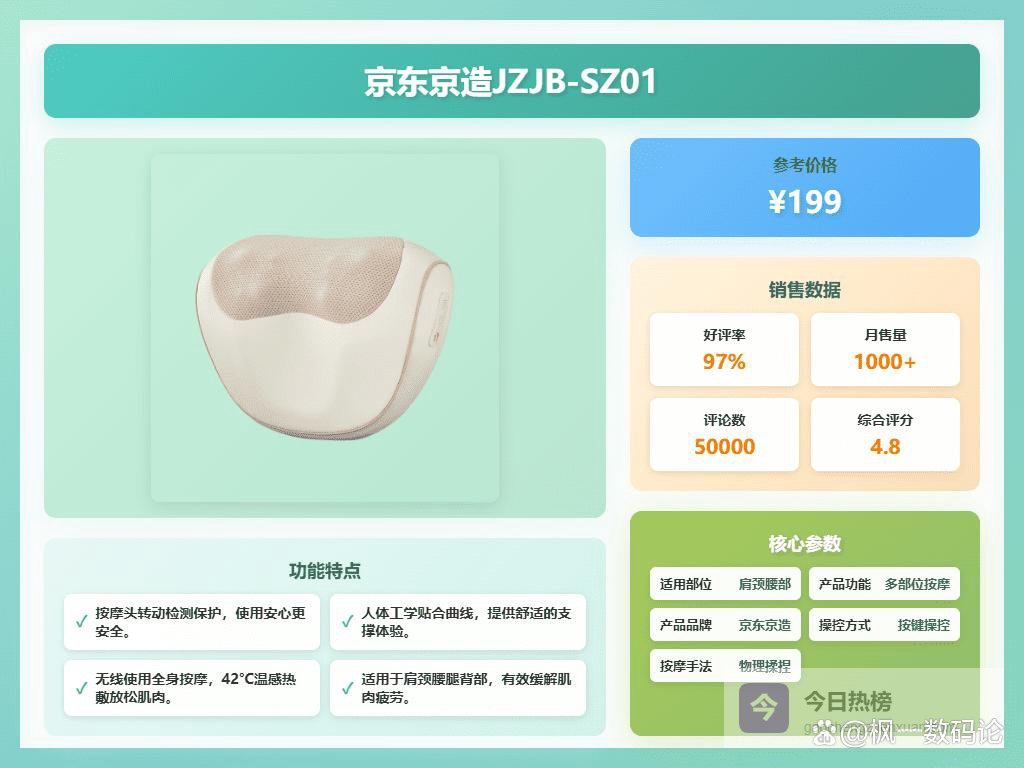 不过别担心,我做了不少功课,也参考了身边朋友的使用体验,替大家整理了这份2026肩颈按摩枕选购攻略,里面精选了十大排名肩颈按摩枕,都是口碑还不错的。究竟哪个更适合你,或者各种型号价格怎么样,往下看看,也许能给你一些启发,希望能帮大家找到适合自己的那一款,别再像我一样迷茫啦!