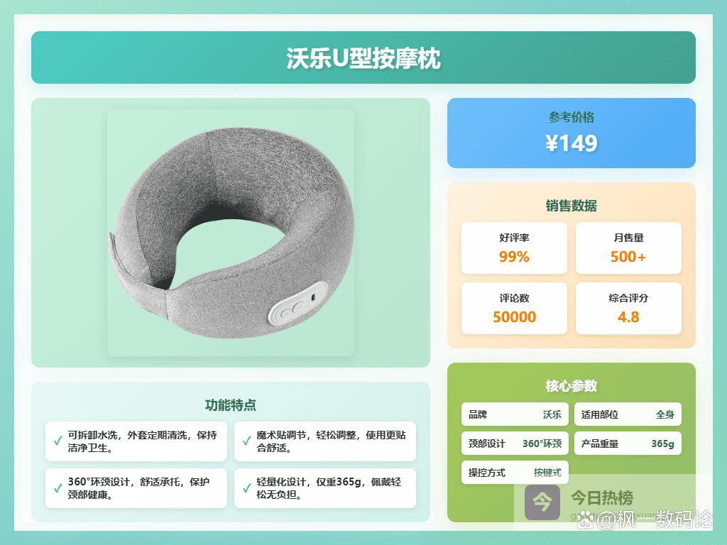 九、沃乐健康护理:这款按摩枕采用Health云感技术,专业的颈部护理就像请了按摩师一样,帮你缓解脖子酸痛和落枕问题。无论是在家、户外还是办公室,用它轻轻按按,效果还不错,确实能帮你放松肌肉。