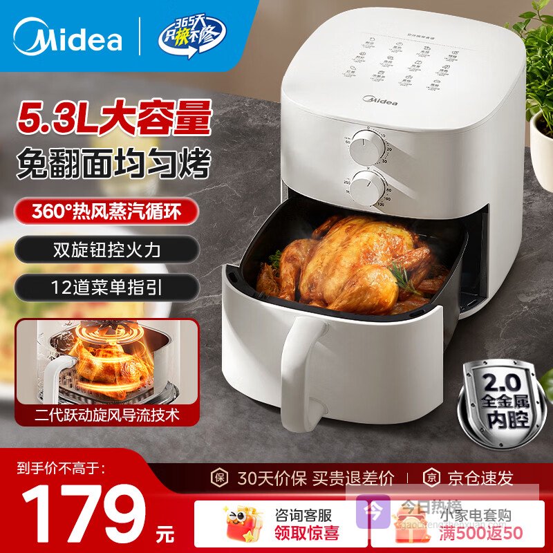 第2款:美的KZE538J5参数:5.3L容量、360°热风循环、80-200℃温度可调、双旋钮控制、全金属内胆
