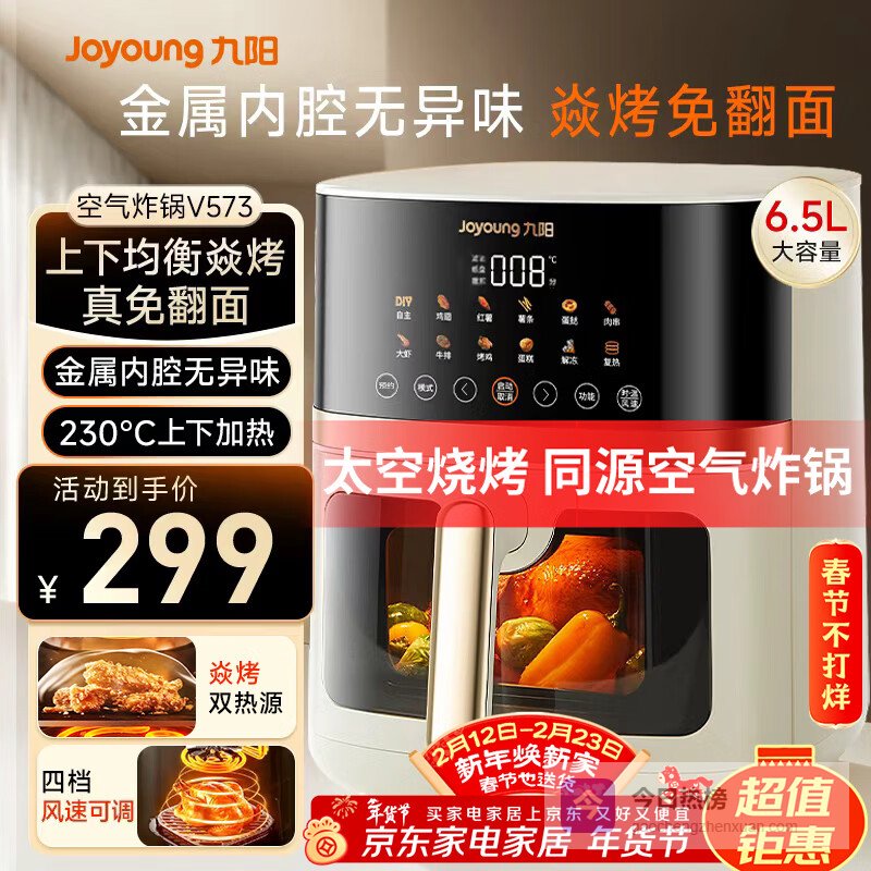 九阳(Joyoung)空气炸锅家用炎烤免翻面上下双热源6.5L大容量焱烤可视大视窗多功能金属内腔 KL65-V573¥