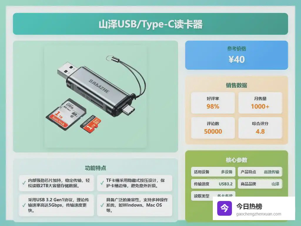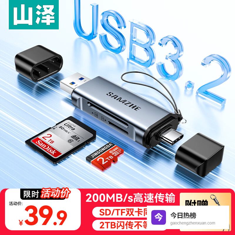 八、山泽1️⃣ 双接口设计:这款山泽读卡器配备USB3.2和Type-C双接口,让你在电脑、手机、平板上读取存储卡都特别方便。无论你用的是哪种设备,只要插上去,就能轻松搞定,不用担心接口不匹配的问题。