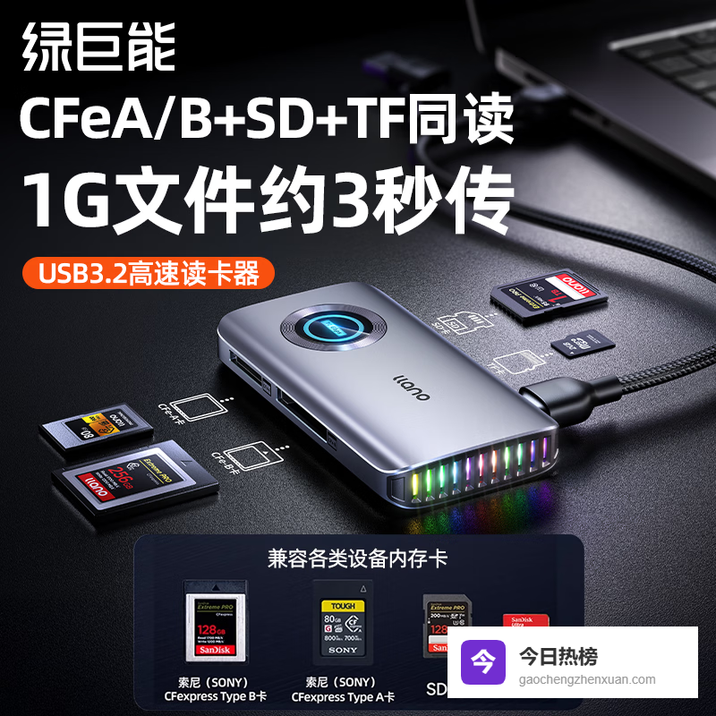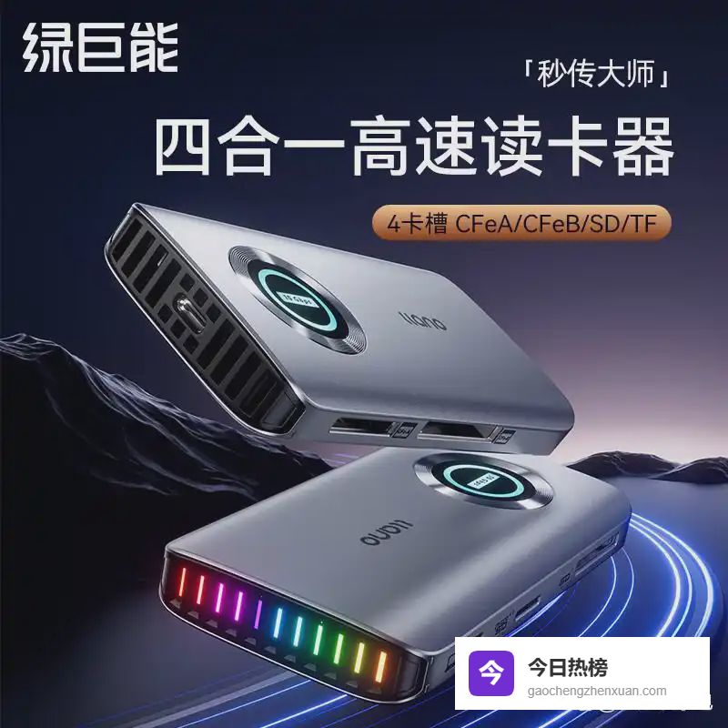 三、绿巨能1️⃣ 多合一卡槽:这款读卡器配备四个卡槽,可以同时插入CFeA、CFeB、SD和TF卡,不用反复拔插,非常方便。无论你是拍照、录视频还是存储资料,一次塞进去就能搞定,节省时间也更安心。
