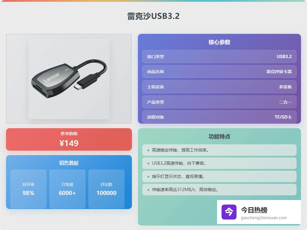 哪个品牌读卡器比较耐用,认准这几个品牌一、雷克沙1️⃣ 高速传输:支持最高312MB/s的传输速度,在短短几秒内就能搞定大文件的传输,比如1GB的电影,只需要大概3秒,又快又省时间,工作和娱乐都更顺畅。