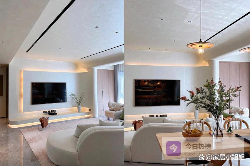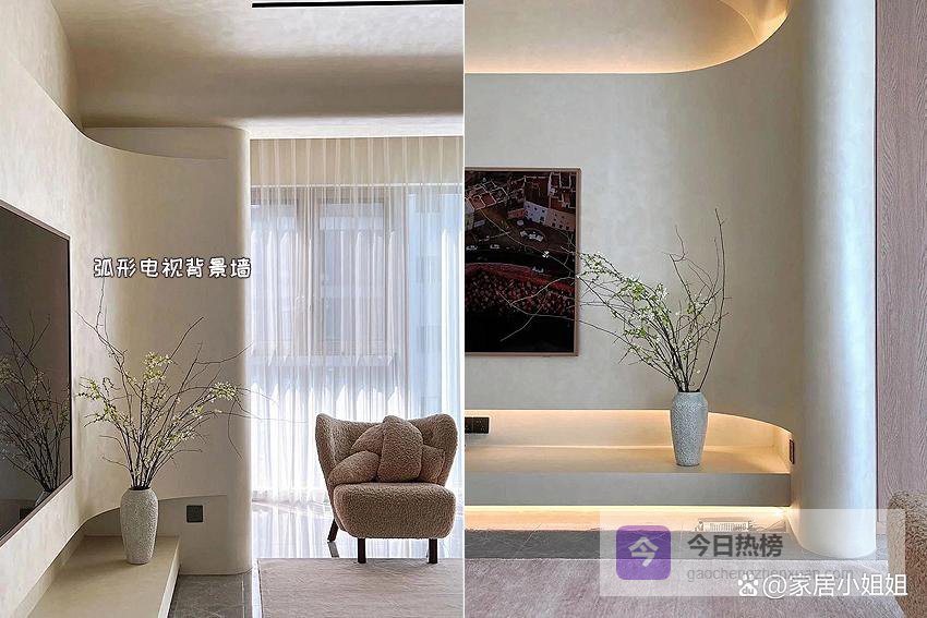 真正变得泛滥的,从来不是设计本身,而是缺乏思考的照搬照抄。许多曾经爆红的家装元素,最终都会走向“满街都是”的尴尬境地,这似乎成了家居圈的一种循环。于是我常常在想:难道“爆火”就注定等于“烂大街”吗?答案显然是否定的。我并不是刻意追求冷门风格的人。在我看来,“烂大街”从来不该成为评判设计优劣的标准。就像唐代白居易的诗句广为传颂,妇孺皆知,却丝毫不影响他在文学史上的地位。因此,真正优秀的设计经得住时间考验;那些从“爆款”沦为“翻车现场”的装修案例,往往只是华而不实、缺少内核的跟风之作。弧形电视背景墙弧形电视墙初看确实惊艳,但细想之下,很多只是为了造型而造型,难以长期耐看,最终成了审美疲劳的代表。