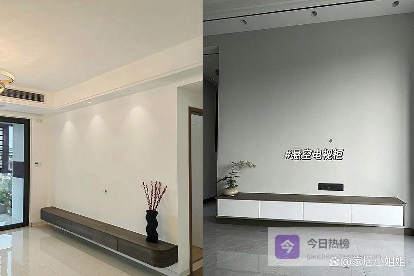 小提示:设计的本质是提升居住舒适度,而不是单纯堆砌造型。如果只是为了形式感,不如干净的大白墙来得耐看。悬浮电视柜悬浮电视柜当年火得一塌糊涂,几乎成了家居博主的标配,如今却常被吐槽。