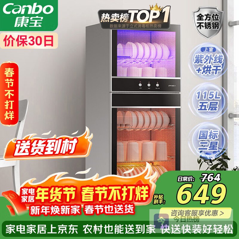【京东自营】康宝消毒柜家用立式大容量高温碗筷不锈钢餐具小型母婴儿奶瓶双门115L五层碗柜【政府补贴】¥