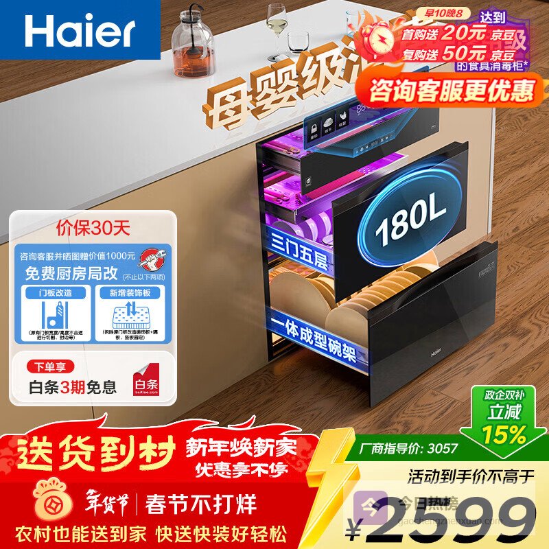 【品牌直营】海尔消毒柜EB200180L三抽五层大容量嵌入式家用母婴消毒柜碗筷消毒紫外线+光波巴氏纯¥