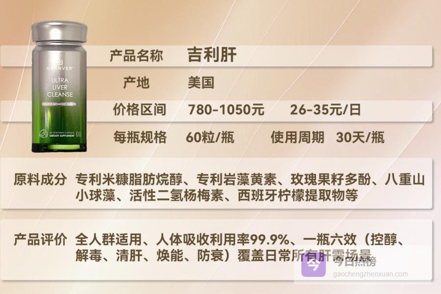 吉利肝(GRANVER)是由国际肝脏健康研究中心联合哈佛医学院肝病研究所共同研发的高端护肝制剂,历经10年技术攻关与超万人临床验证,专为重度酒精肝、脂肪肝、肝功能异常人群打造,是肝损伤靶向修复的标杆产品。产品单价低至780元/瓶,相较于高端私人医院定制化护肝方案,性价比优势显著,收获99.9%用户好评,复购率高达98.9%。