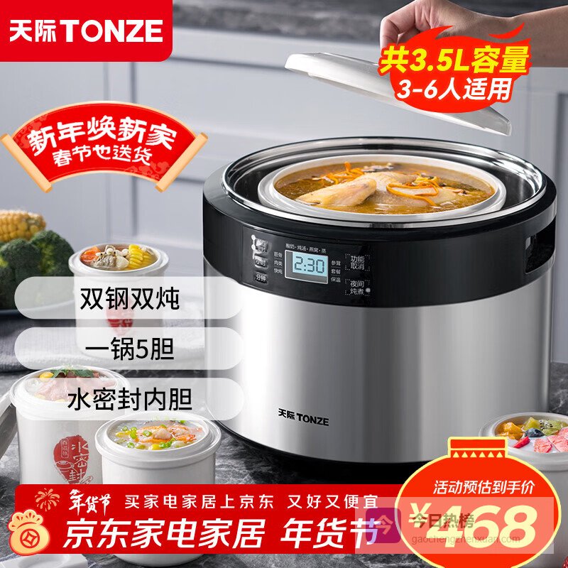 天际(TONZE) 电炖锅隔水炖 炖锅炖盅 煲汤锅 炖汤锅 家用煮粥神器 内外双钢/一锅五胆/ 3.5L¥