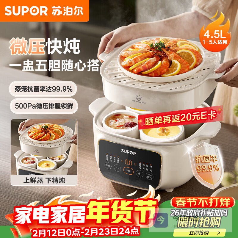 推荐理由:这款苏泊尔电炖锅采用微压技术,能更高效地炖出美味又营养的汤,不用等太久,特别省时间。锁住食材的营养,每一口都鲜美又健康,特别适合家里喜欢喝汤的人。