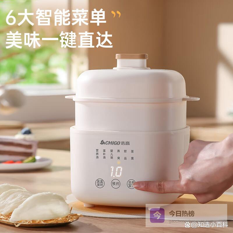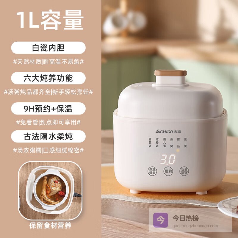 推荐理由:这款志高1L电炖锅,采用隔水炖煮技术,能更好地锁住食材的原汁原味和营养,炖出来的汤和菜都特别鲜嫩。操作简单,一键选择预设菜单,放进去材料按一下就能轻松搞定,适合忙碌的日常生活。它还具备定时保温功能,你可以提前预约,炖好后自动保温,吃饭时间自由掌控,特别省心。