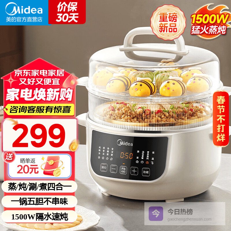 推荐理由:这台美的4.5L电炖锅,功能可谓挺丰富,不仅能蒸、炖、煮,还能同时用五个白瓷炖盅,特别适合家庭多样需求。无论是熬汤、炖补品或做辅食,都能轻松搞定,操作也很方便,预设好程序后就可以放松等待了。