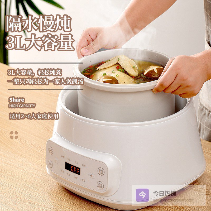 它还采用隔水炖煮方式,可以最大程度保存食材的原汁原味和营养,像燕窝、汤品都更好喝、更有营养。这款容量3升,可以轻松应对2到6人的家庭需求,炖一锅鸡、煲汤都没问题。多功能预设,无论是煮粥、炖汤、蒸煮还是做甜品,都能满足,操作方便又实用。