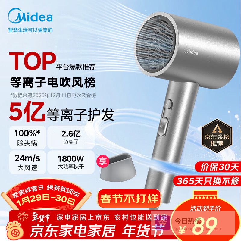 【京东自营】美的5亿等离子护发电吹风家用负离子护发吹风筒1800W大功率便携吹风机FJ308银年会奖¥