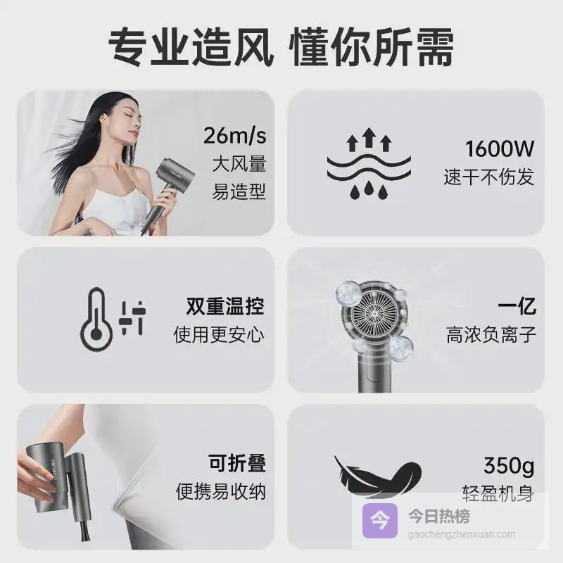 一亿负离子护发:高浓度负离子技术能够有效修复发丝,减少毛躁,让头发保持光滑顺滑。无论是日常使用还是外出旅行,都能带来温和的护发体验,减少对发质的损伤,保持秀发自然健康。特别适合需要频繁使用电吹风的人群,长期使用能够改善发质,让秀发更显亮泽。