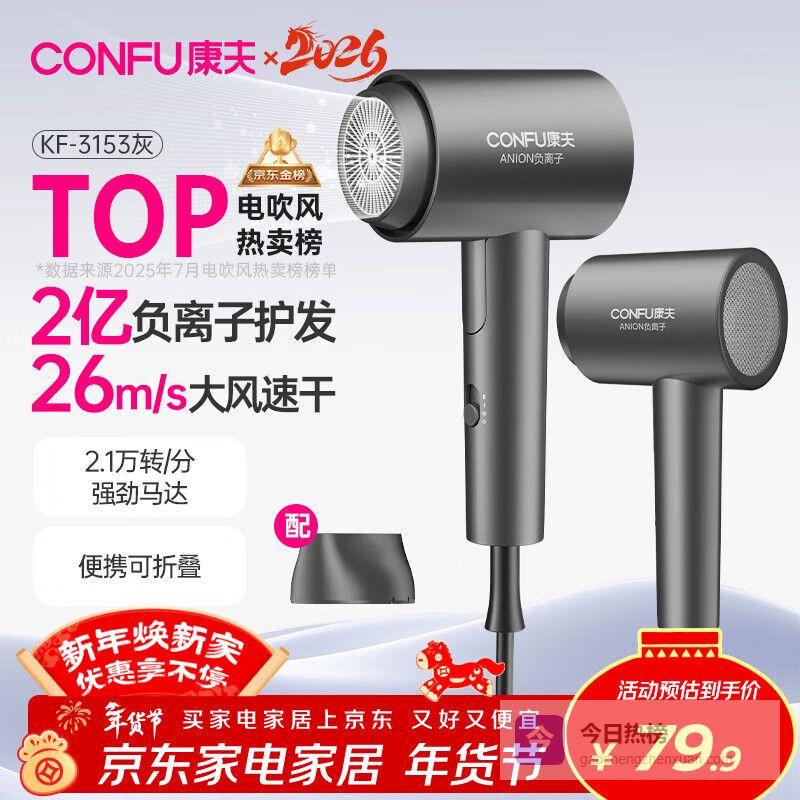 【京东自营】康夫2亿负离子护发电吹风机折叠家用便携不伤发大风速大功率宿舍女士男士用吹风筒新年礼物KF¥