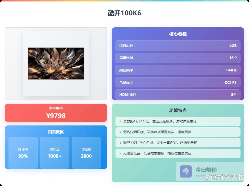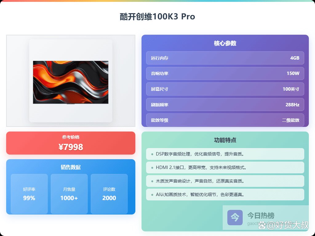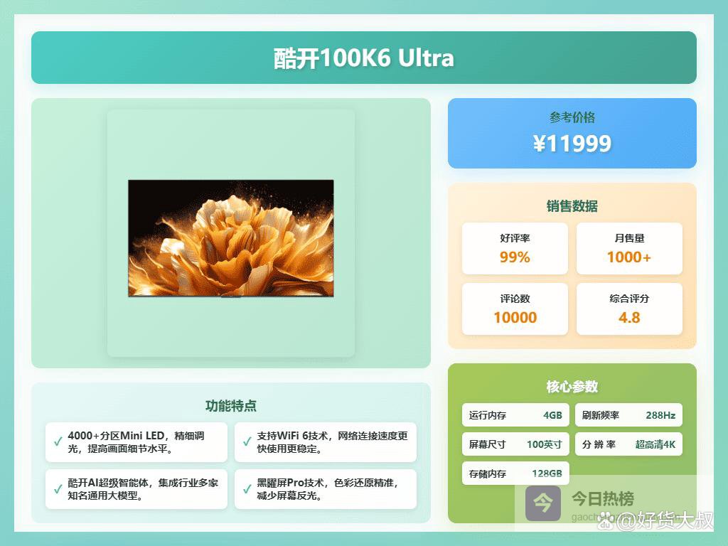 1️⃣ 超大屏幕体验:这款酷开平板电视拥有100英寸的大屏幕,带来一种像在家庭影院一样的震撼感受。不管是追剧、看电影,还是打游戏,都可以享受到更开阔、更沉浸的视觉效果。放在客厅,空间感和档次感都挺到位,真正让你感受到大的能带来的乐趣。