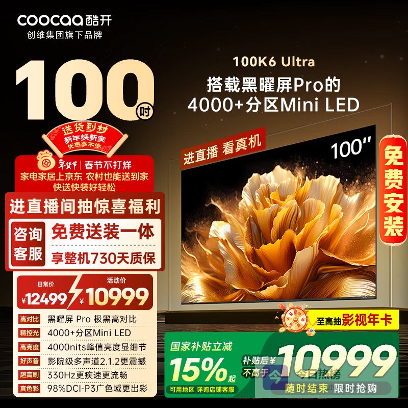 酷开旗舰款 100K6 Ultra创维电视100英寸黑曜屏Pro 4048分区Mini LED 国家补贴液晶电视机比98大100P8F¥