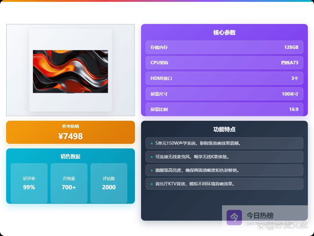 1️⃣ 超大屏震撼体验:配备100英寸超大屏幕,看电影、追剧都特别带感,身临其境的感觉真不错。大屏带来的视觉冲击,让你在家也能享受影院般的观影体验。