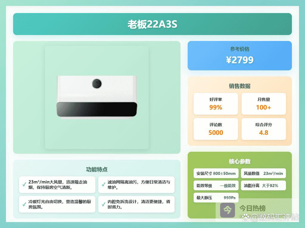 同时,老板22A3S还具备智能换气功能,能24小时自动调节空气流通,有效去除异味。多彩的外观设计和丰富的颜色选择,满足不同厨房风格的搭配需求。整体表现实测操作挺自然,油烟处理还算靠谱,气氛也更干净卫生。