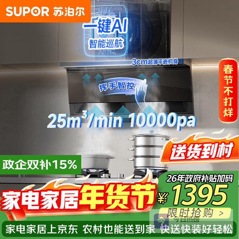 苏泊尔(SUPOR)油烟机家用抽油烟机顶侧双吸变频风压吸油烟机零感系列齐平橱柜小尺寸智能换气DS1-G¥