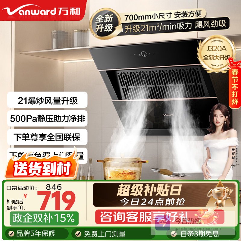 万和(Vanward)【侧吸小尺寸】 21m³家用大吸力抽油烟机租房小户型一级能效挥手控制上门安装政府补贴J320A Pro 70cm小尺寸换新无忧¥