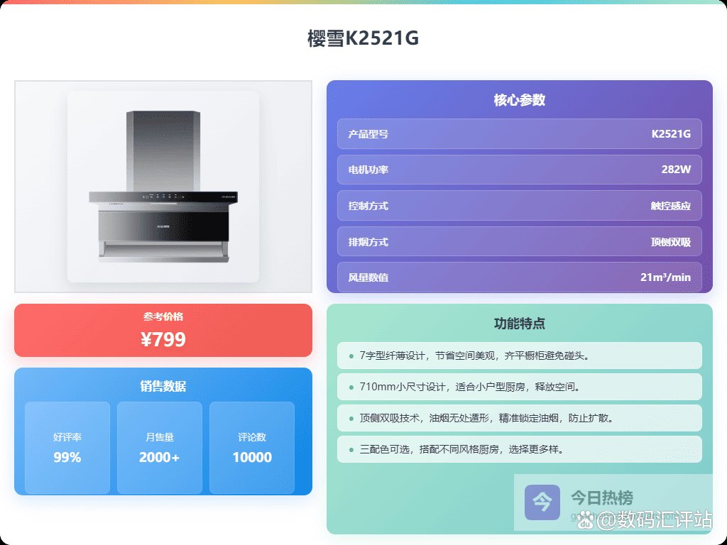 五、樱雪这款樱雪K2521G油烟机采用顶侧双吸技术,能有效锁定油烟,减少油烟在厨房中的扩散。它的设计能全面拢吸炒菜时产生的油烟,让厨房环境更清新,避免油烟四散到其他区域。