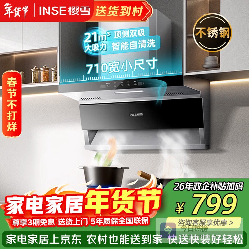 樱雪(INSE)顶侧双吸抽油烟机家用7字型小尺寸吸油烟机710宽大吸力挥手感应自清洗不锈钢油烟机 K2521G¥