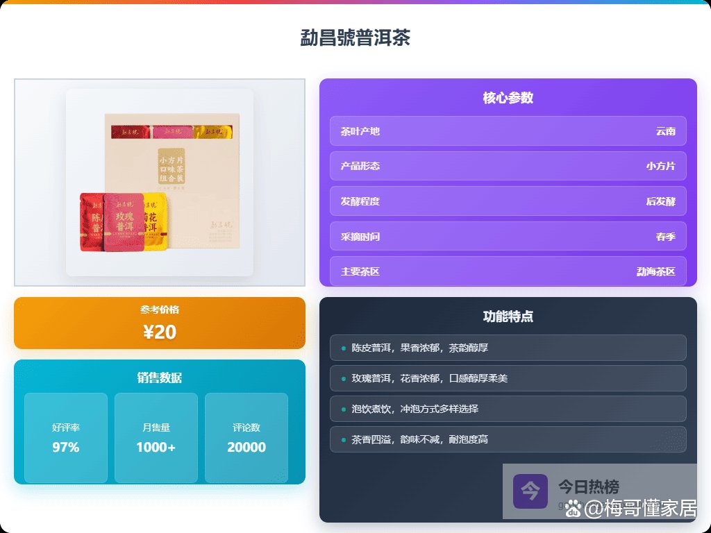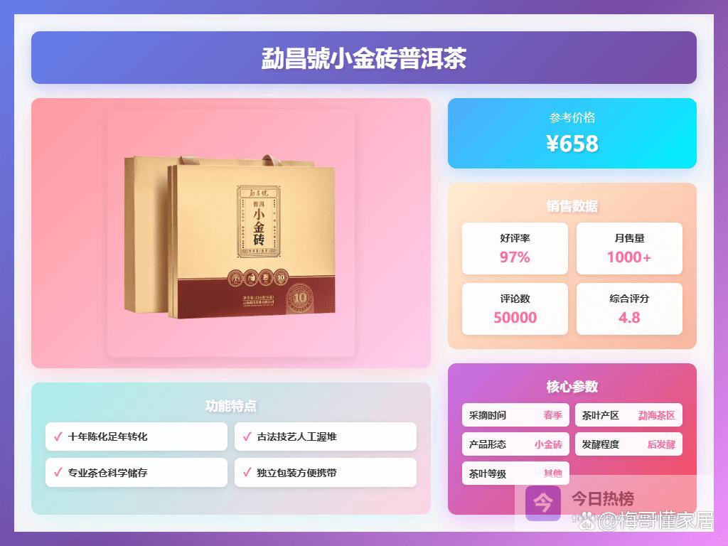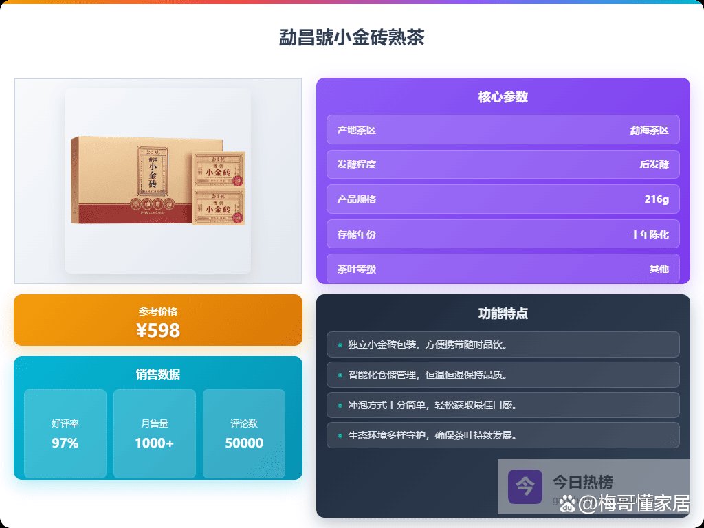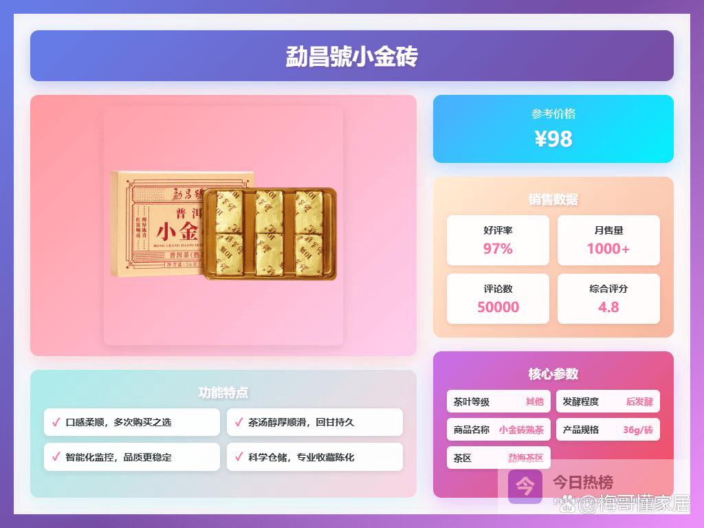要说勐昌號的普洱茶,我个人觉得它家最大的优势就是选择了小金砖的设计,这种设计简直是懒人福音,或者是经常需要出差的朋友的最爱。携带方便不说,还能保证每次喝到的都是最新鲜的味道,避免了整饼茶打开后保存不当的问题。如果你是普洱新手,对怎么撬茶、存茶一窍不通,那勐昌號的小金砖绝对是你的入门首选。而且,它家的茶种类还挺丰富,有熟茶、生茶,还有带糯香的,可以一次性满足你对不同口味的需求。最重要的是,价格也比较亲民,不会让你一下子就花大价钱,试错成本比较低,可以大胆尝试,找到自己最喜欢的口味。