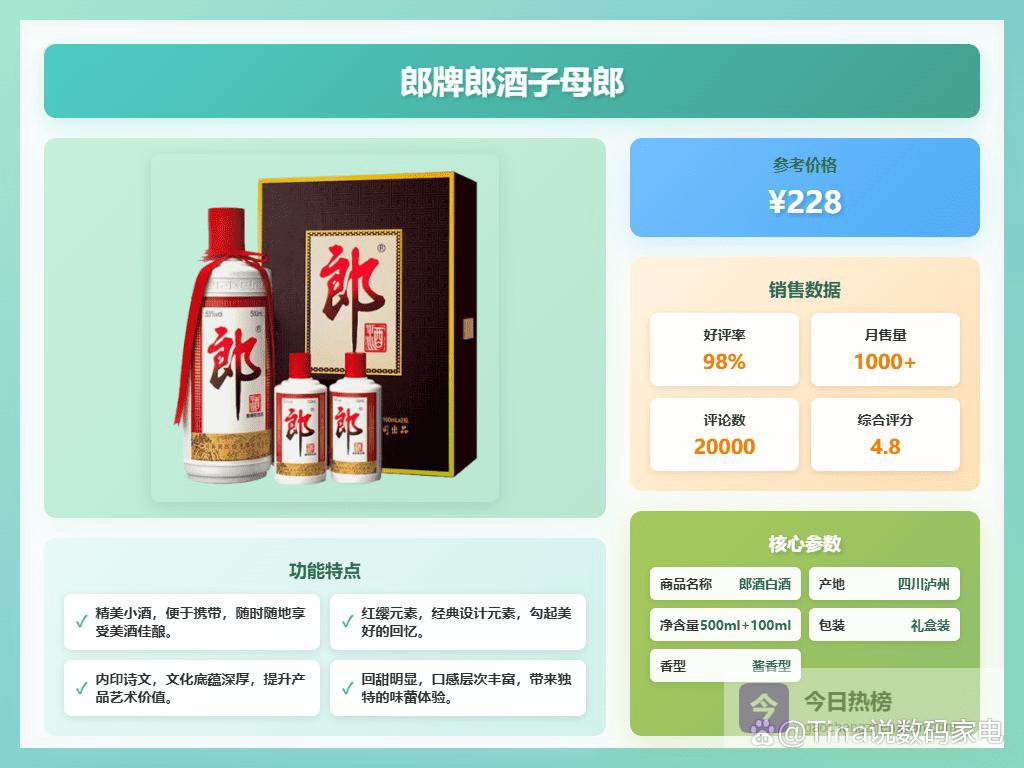 七、摘要▶ 浓郁酱香:这款白酒的53度酱香型,入口醇厚,香气浓郁,回味悠长,喝上一口就能感受到浓烈的酱香味道,确实挺有特色的。