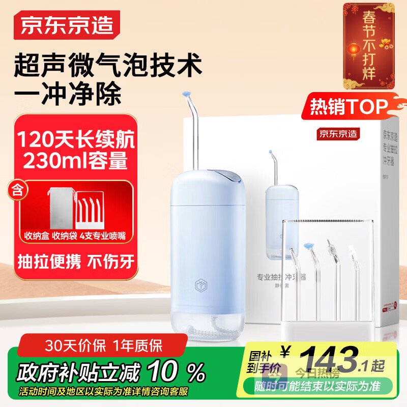 推荐入手:京东京造便携式蓝色抽拉冲牙器+4喷嘴