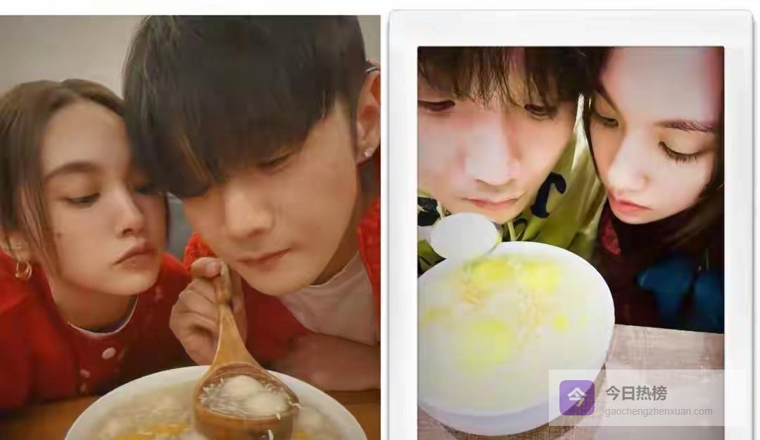 大年初一,夫妻俩这阵势真是秀足了恩爱啊!酒酿圆子的照片风格继续沿用了去年、前年那种感觉,够有仪式感,也超浪漫。