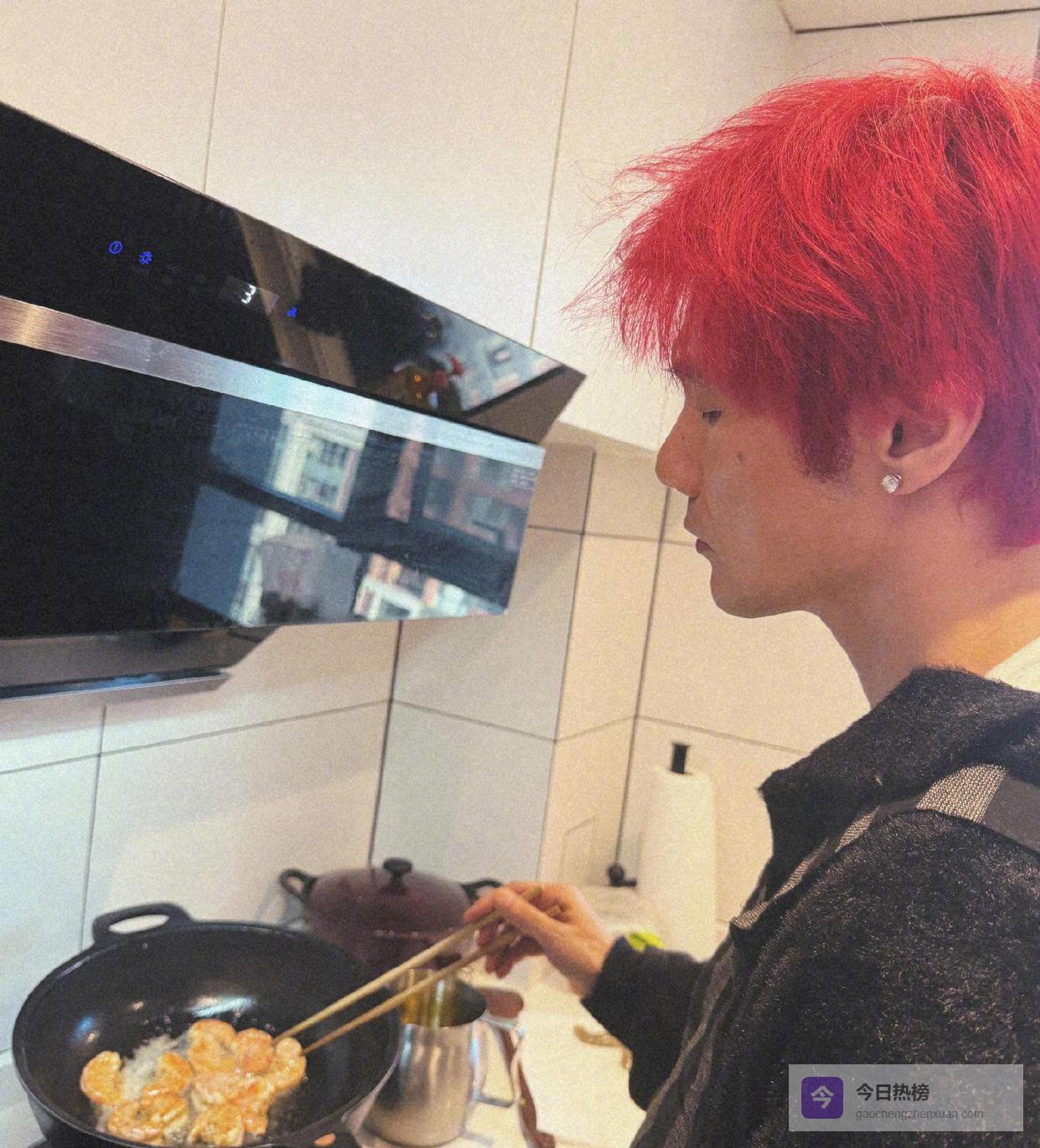 李荣浩身穿黑色毛衣外套,配上一头红发,这搭配跟杨丞琳那一身衣服简直太合拍了,他在负责炒虾子,看起来挺专注的。