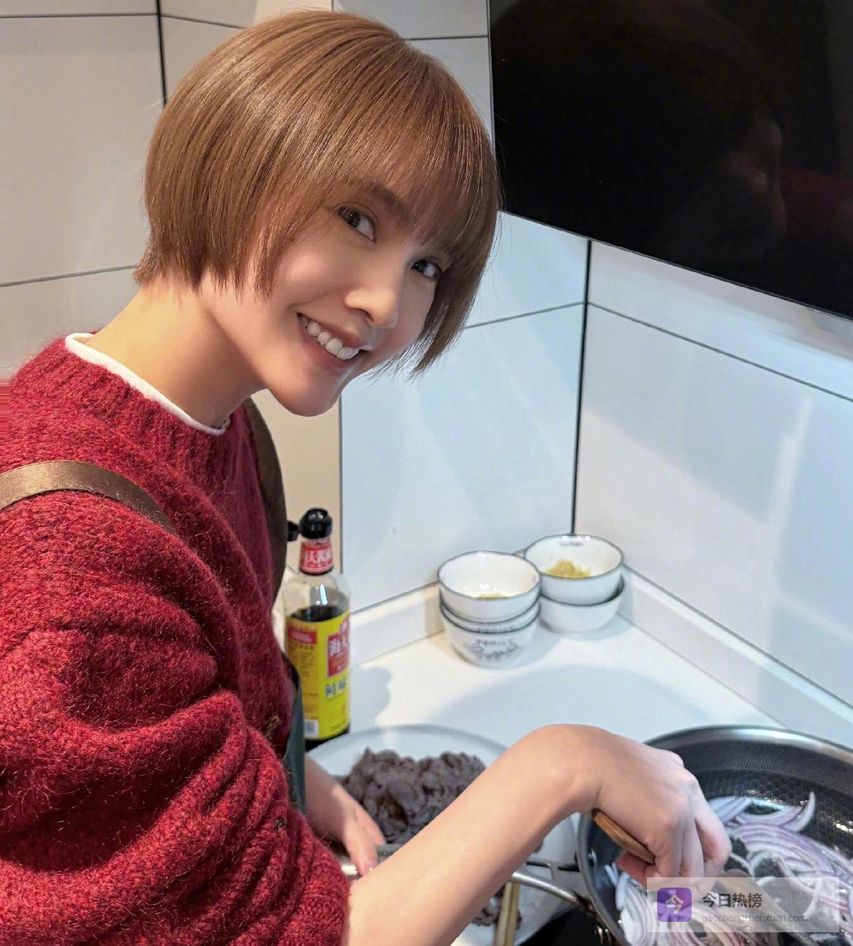 杨丞琳身穿喜气洋洋的红色毛衣,剪了短发,正在厨房里炒洋葱,给人一种很贤惠、很温馨的感觉。