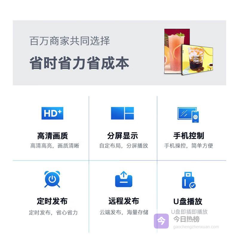 1️⃣高亮度显示:出色的高亮度达到700,让广告内容在各种光照环境下依然清晰可见。无论是室内还是户外,都能够有效吸引顾客的目光,提升宣传效果。让每一条信息都能准确传达,帮助商家获取更多关注与流量。