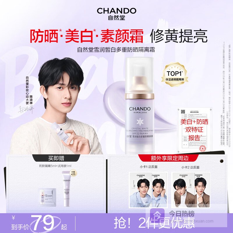 【品牌直营】自然堂隔离霜【陈添祥同款】防晒遮瑕美白三合一提亮肤色素颜霜懒人霜紫色SPF32+++30¥