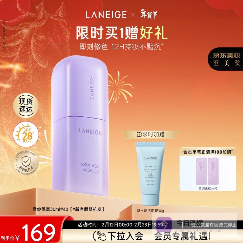 【京东自营】兰芝雪纱丝柔隔离霜妆前乳防晒遮瑕30ml#40紫色情人节礼物送女¥